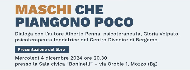 Dialoga con l’autore Alberto penna, psicoterapeuta, Gloria Volpato, psicoterapeuta fondatrice del Centro Divenire di Bergamo.